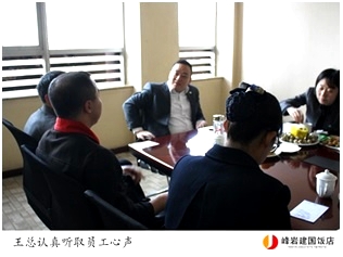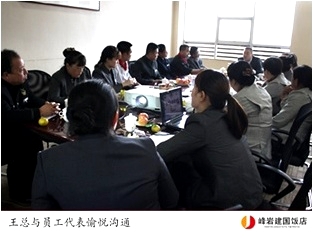 王總認(rèn)真聽取了大家提出的問題,現(xiàn)場(chǎng)面對(duì)面地與大家進(jìn)行了思想交流與溝通,對(duì)一些亟需解決的困難和問題現(xiàn)場(chǎng)做了鄭重承諾與解答,并感謝員工對(duì)酒店工作的幫助和努力,也希望大家今后繼續(xù)為酒店獻(xiàn)計(jì)獻(xiàn)策,與酒店共同成長。